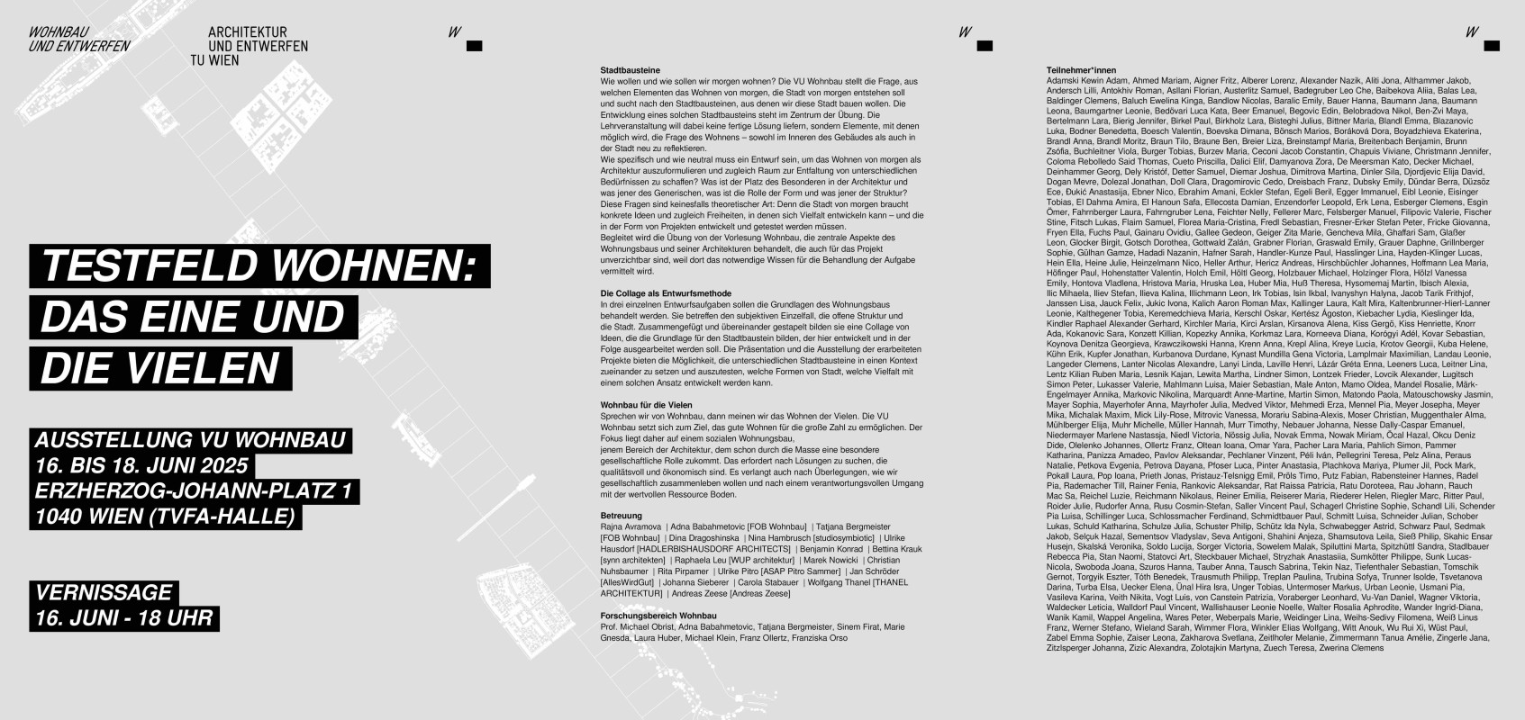 Die Ausstellung der Ergebnisse der Übung "Testfeld Wohnen: Das Eine und die Vielen" fand vom 16. - 18. Juni 2025 in der TVFA-Halle statt.