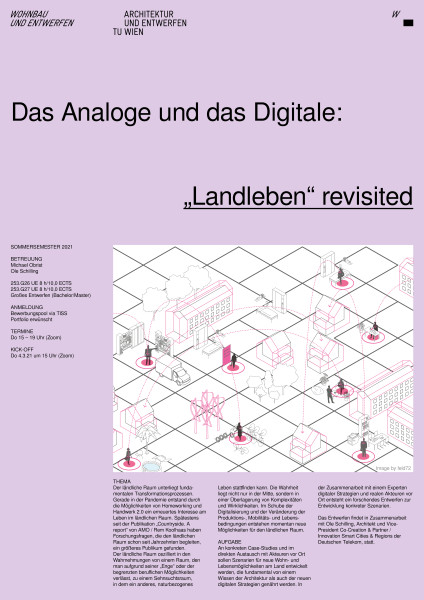 Spätestens seit der Publikation „Countryside. A report“ von AMO / Rem Koolhaas haben Forschungsfragen, die den ländlichen Raum schon seit Jahrzehnten begleiten, ein größeres Publikum gefunden. Der ländliche Raum oszilliert in den Wahrnehmungen von einem Raum, den man aufgrund seiner „Enge“ oder der begrenzten beruflichen Möglichkeiten verlässt, zu einem Sehnsuchtsraum, in dem ein anderes, naturbezogenes Leben stattfinden kann. Die Wahrheit liegt nicht nur in der Mitte, sondern in einer Überlagerung von Komplexitäten und Wirklichkeiten. Im Schube der Digitalisierung und der Veränderung der Produktions-, Mobilitäts- und Lebensbedingungen entstehen momentan neue Möglichkeiten für den ländlichen Raum. An konkreten Case-Studies und im direkten Austausch mit Akteuren vor Ort sollen Szenarien für neue Wohn- und Lebensmöglichkeiten am Land entwickelt werden, die fundamental von einem Wissen der Architektur als auch der neuen digitalen Strategien genäht werden. In der Zusammenarbeit mit einem Experten digitaler Strategien und realen Akteuren vor Ort entsteht ein forschendes Entwerfen zur Entwicklung konkreter Szenarien.