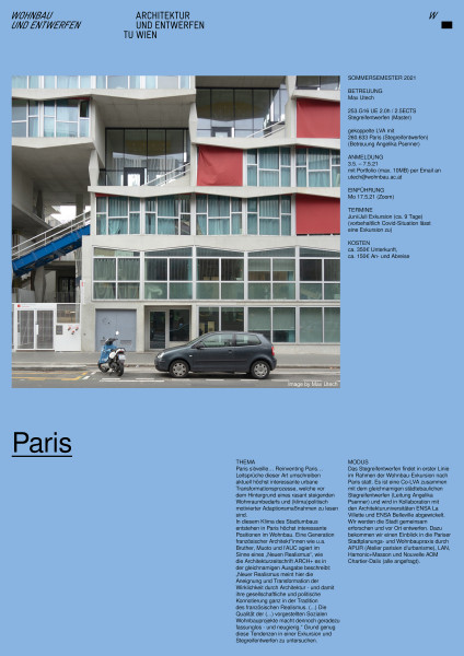 Das Stegreifentwerfen findet in erster Linie im Rahmen der Wohnbau-Exkursion nach Paris statt. Es ist eine Co-LVA zusammen mit dem gleichnamigen städtebaulichen Stegreifentwerfen (Leitung Angelika Psenner) und wird in Kollaboration mit den Architekturuniversitäten ENSA La Villette und ENSA Belleville abgewickelt. Wir werden die Stadt gemeinsam erforschen und vor Ort entwerfen. Dazu bekommen wir einen Einblick in die Pariser Stadtplanungs- und Wohnbaupraxis durch APUR (Atelier parisien d'urbanisme), LAN (Umberto Napolitano), Hamonic+Masson und Nouvelle AOM Chartier-Dalix (alle angefragt).