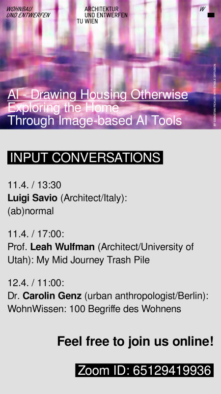 KI ist überall, Architektur ist hier keine Ausnahme. KI infiltriert verschiedene Aspekte unseres täglichen Lebens - von Gesichtserkennung und Social Media Feeds bis hin zu selbstfahrenden Autos und Hausautomatisierung - und wurde 2022 mit dem benutzerfreundlichen Chatbot ChatGPT für eine breiten Öffentlichkeit zugänglich. Im Designstudio werden wir KI-Difusionmodelle wie Midjourney erforschen, die generative Text-zu-Bild-Tools sind und mit künstliche Intelligenz Bilder erzeugen, die auf Text Promt ihren Nutzer*innen basieren. Die Rolle der Sprache im kreativen Prozess wird also an Bedeutung gewinnen. Wird es in Zukunft Prompt-Designer geben, die auf die Beziehung zwischen Sprache und Architektur spezialisiert sind? Oder werden wir bei der Beschreibung dessen, was Wohnen ausmacht, mit den Grenzen der Sprache konfrontiert?