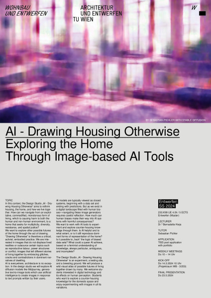 This Design Studio "AI - Drawing Housing Otherwise" is an experiment, a testing site, and a breeding ground. We will produce a wild visual atlas of possible futures of living together drawn by many. We welcome students interested in digital technology and its effects on human perception. Students who want to explore a counter-housing knowledge of the domestic space and enjoy experimenting with images in all their variations.