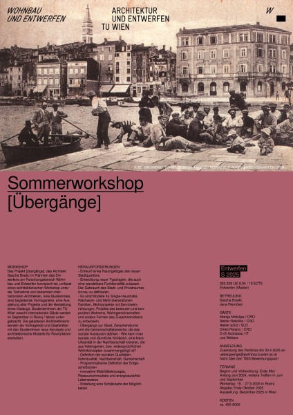 Das Projekt [übergänge], das Architekt Sascha Bradic im Rahmen des Entwerfens am Forschungsbereich Wohnbau und Entwerfen konzipiert hat, umfasst einen architektonischen Workshop unter der Teilnahme von bekannten internationalen Architekten, eine Studienreise, eine begleitende Vortragsreihe, eine Ausstellung aller Projekte und die Herstellung eines Katalogs. StudentenInnen der TU Wien sowohl internationale Gäste werden im September in Rovinj / Istrien untergebracht. Die geladenen ArchitektInnenn werden als Vortragende und Gastkritiker mit den StudentInnen neue Konzepte und architektonische Modelle für Rovinj/Istrien erarbeiten.