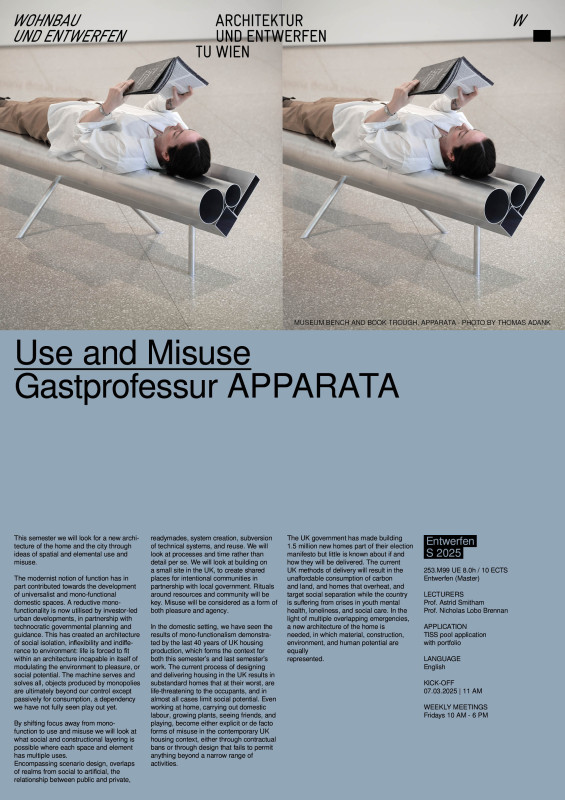 Encompassing scenario design, overlaps of realms from social to artificial, the relationship between public and private, readymades, system creation, subversion of technical systems, and reuse. We will look at processes and time rather than detail per se. We will look at building on a small site in the UK, to create shared places for intentional communities in partnership with local government. Rituals around resources and community will be key. Misuse will be considered as a form of both pleasure and agency.