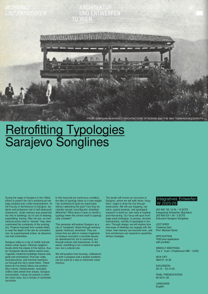 This semester will explore Sarajevo as a city of “songlines” drawn through memory: spatial, historical, emotional. They are traces that are able to connect fragments (a mosque courtyard, a socialist square, an abandoned lot) not in continuity, but through echoes and resonances. In this sense, retrofitting is not a technical operation, but a cultural one.