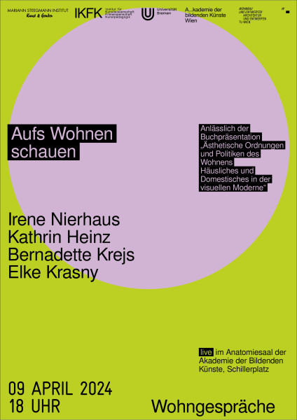 Eine gemeinsame Veranstaltung des Forschungsfeldes wohnen+/-ausstellen, Institut für Kunstwissenschaft – Filmwissenschaft – Kunstpädagogik/Mariann Steegmann Institut. Kunst & Gender an der Universität Bremen mit dem Fachbereich Kunst und Bildung an der Akademie der bildenden Künste Wien und dem Forschungsbereich für Wohnbau und Entwerfen an der Technischen Universität Wien.