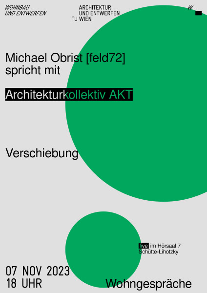 Das Architekturkollektiv AKT wurde 2019 gegründet und zählt aktuell 17 Mitglieder. Im Rahmen des Wohnbaugesprächs spricht AKT über seine Projekte und die Arbeit im Kollektiv. Ziel von AKT ist es, Architektur als Eingriff in gesellschaftliche Zusammenhänge herzustellen. Die Zusammenarbeit im Kollektiv heißt nicht nur Mehraufwand der gemeinsamen Entscheidungsfindung, sondern auch Mehrwert einer anderen Herstellung von Raum. Entwurf und Ausführung steigern sich aneinander ebenso wie