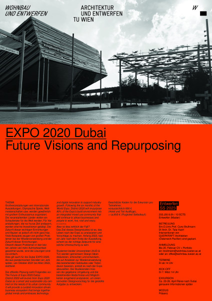 Studierende beider Universitäten (AUD & TU) werden gemeinsam Design-Ideen diskutieren, erforschen und entwickeln, die auf Ansätzen zur Wiederverwendung des bestehenden Gebäudes oder Teilen davon basieren, anstatt es nach der Expo abzureißen. Die Studierenden müssen die gegebene Umgebung und die bestehenden Bedürfnisse und Möglichkeiten eingehend analysieren, um einen sinnvollen Designvorschlag für die gestellte Aufgabe zu entwickeln.