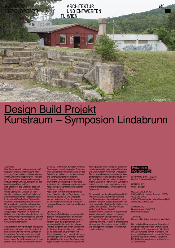 Das Design-Build Projekt „Kunstraum Lindabrunn“ umfasst nicht nur die Konzeption, Entwurfs- und Ausführungsplanung, sondern auch die eigenhändige Übersetzung des Geplanten in die gebaute Realität. Zwischen der ersten Skizze und der Fertigstellung des Gebauten, gilt es für die beteiligten Studierenden vielfältigste Aufgaben und Herausforderungen zu bewältigen. Die Studierenden arbeiten dabei kollaborativ, als großes Team, und tragen kollektiv die Verantwortungen und Konsequenzen ihres Handelns. Sie lernen mit definierten Budgets, engen Zeitplänen und unerwarteten Problemen umzugehen. Die Kommunikation innerhalb des großen studentischen Teams spielt genauso eine wichtige Rolle, wie auch das Interagieren mit der Bauherrin - dem Verein Symposion Lindabrunn und deren Mitgliedern, sowie mit lokalen Behörden, Fördergebern und Sponsoren.
