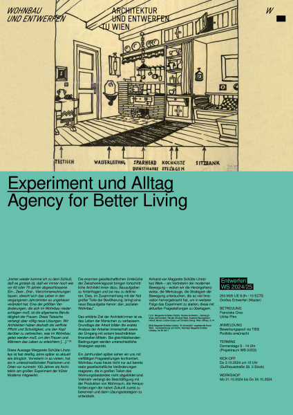 Anhand von Magarete Schütte-Lihotzkys Werk – als Vertreterin der modernen Bewegung – wollen wir die Herangehensweise, die Werkzeuge, die Strategien der Bewegung untersuchen, die so viel Innovation hervorgebracht hat, um in weiterer Folge das Experiment zu wagen, diese mit aktuellen Fragestellungen zu überlagern.