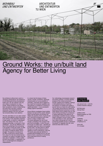 In a closer look the beauty of these natures unravels: sometimes, apparently innocent parks turn out as products of coloniality, untouched nature happens to be a result from extractive capitalism and wild greenery is revealed as a practice of capital speculation – or as a purposeful strategy against exploitation. Ground Works investigates these dualities between the built and the unbuilt, between what is termed Nature and Society and reflects the question of land, of ground and soil in dominant architecture and urban culture in today’s multiple crises. The studio addresses the role of land through a rereading of the concept of the park and its ecologies, in which the park – for the lack of a better word – describes all accessible open land, that is not occupied by built mass. The task will be to rethink the park in an open architecture that is capable to house contemporary urban life. The studio pays particular attention to possible decommodified forms of use and tenure of land, to practices of commoning and to alternative forms of making architecture.