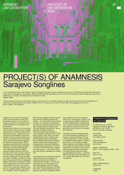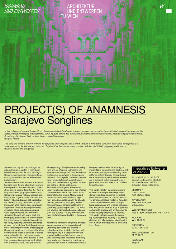 Anamnesis here is not simply the archaeology of memory but the recognition of underlying structures and systems — cultural as well as spatial — that are still forming the city. It is the practice of working within Sarajevo’s inherited geometries, retrieving their capacities, extending their reach, and discovering how they can generate new forms of inhabitation without being reduced to relics. Not a singular image. Not a clean diagram. Rather, a set of architectures capable of holding several times, different spatial conceptions at once, in which the past is neither erased nor embalmed, but remains active as a generative force that asks to be unveiled by architecture.