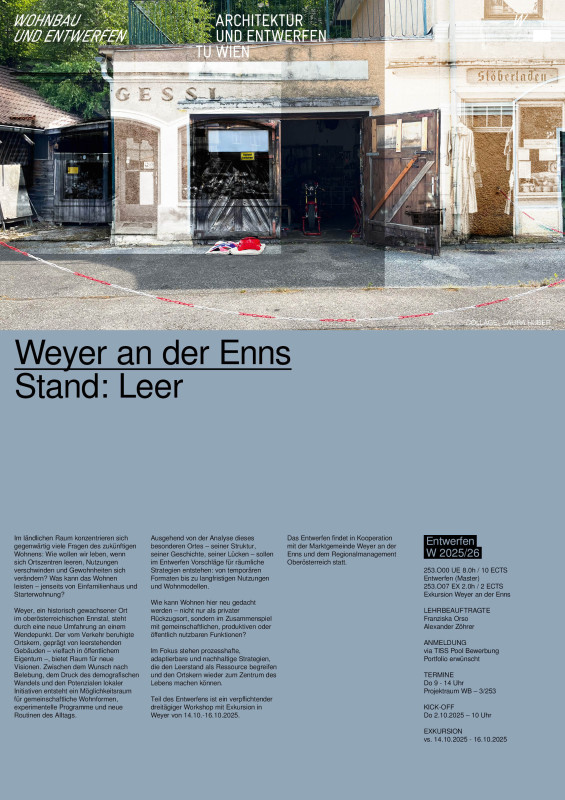 Teil des Entwerfens ist ein verpflichtender dreitägiger Workshop mit Exkursion in Weyer von 14.10. – 16.10.2025.